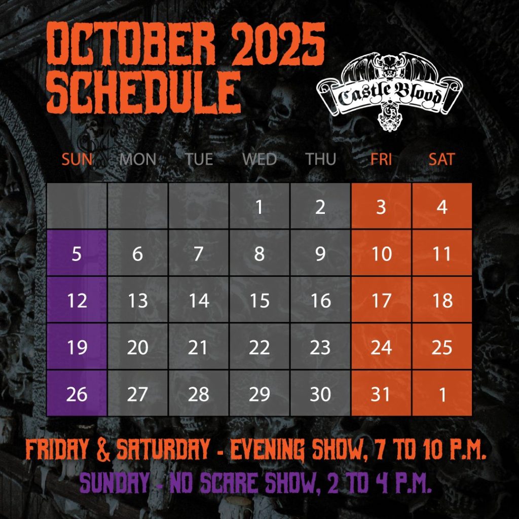 Castle Blood is open weekends in October plus Halloween night and November 1 in 2025.
